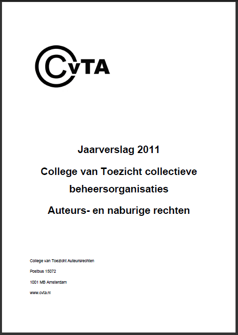 Met uitgebreid voorwoord waarin credit- en debitzijde worden belicht en uitgebreid, getuige de inhoudsopgave, stil wordt gestaan bij de gewezen uitspraken. Uit 't voorwoord: 2011 was een jaar waarin op het gebied van collectief beheer het nodige is bereikt maar dat ook een aantal dieptepunten kende.