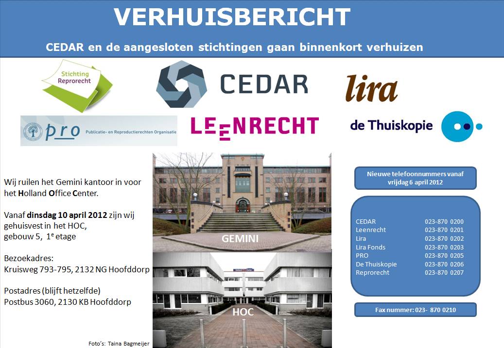 Op donderdag 5 april 2012 verhuizen de telefoonlijnen van CEDAR en de aangesloten stichtingen naar het Holland Office Center (HOC). Op deze dag zijn wij telefonisch niet bereikbaar. Op vrijdag 6 april is de algehele verhuizing. Het is mogelijk dat wij die dag niet goed bereikbaar zijn. Wij vragen uw begrip hiervoor en stellen alles in het werk om na het Paasweekend, op dinsdag 10 april, weer volledig operationeel te zijn. (klik afbeelding voor vergroting)