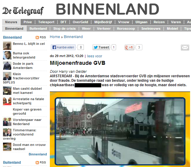 Als randvermelding. Mediarecht. Onrechtmatige publicatie in De Telegraaf. Op 29 maart 2010 staat op de website en op de voorpagina: "Miljoenfraude GVB": "Bij de Amsterdamse stadsvervoerder GVB, dat voor het grootste gedeelte wordt gefinancierd met belastinggeld, zijn miljoenen verdwenen door fraude. Dat blijkt uit een onthullend verhaal dat morgen in De Telegraaf verschijnt." De aangehaalde bronnen [red. zie citaten] zijn onvoldoende feitelijk om de ernstige beschuldigingen te ondersteunen. De rechtbank gaat over tot aanhouding om de schade nader te specificeren.