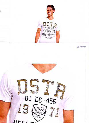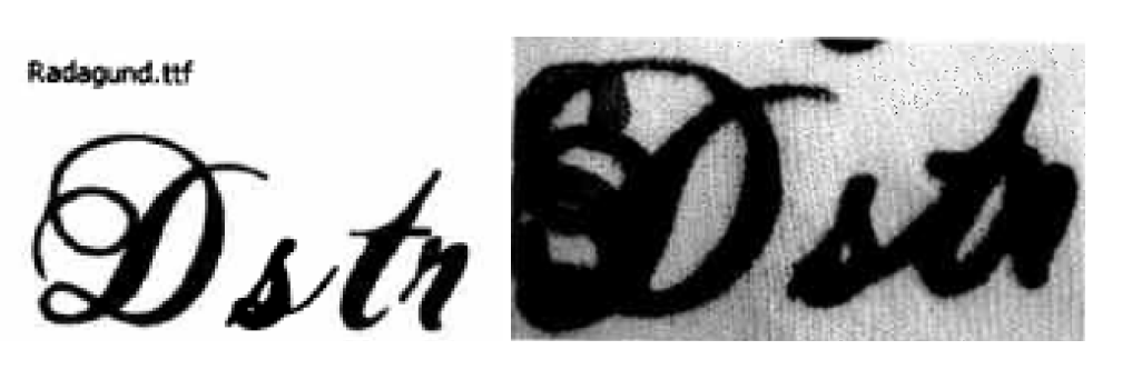 Kledingstuk vi 4.13. Twijfel over de vraag of het teken afgebeeld op kledingstuk (vi) onder het gebod valt, bestaat naar voorlopig oordeel niet. Bij het daarop afgebeelde teken, weergegeven in schrijfletter, is een duidelijke afstand waarneembaar tussen de letter ‘D’ en de letters ‘str’. Zoals G-Star onweersproken heeft gesteld vloeit dit niet voort uit het door C&A voor dit T-shirt toegepaste lettertype Radagund (dat overigens ook door G-Star wordt gebruikt op sommige van haar kledingstukken). Bij gebruik daarvan zou het teken zijn weergegeven zoals hieronder links afgebeeld. De letterzetting van de letters ‘str’ is door C&A echter zodanig aangepast dat de letters s, t en r tegen elkaar aan zijn gedrukt (hieronder rechts weergegeven), met als resultaat dat visueel een duidelijke afstand is gecreëerd tot de letter ‘D’.