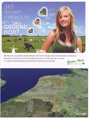 Auteursrecht. Persoonlijkheidsrechten. Licentie beeldmateriaal Google Earth software strekt niet uit tot gebruik van beeldmateriaal daaruit. Mzoem slaagt niet in bewijzen dat licentie gebruik van luchtfoto's in folders Stichting Groene Hart toestaat.