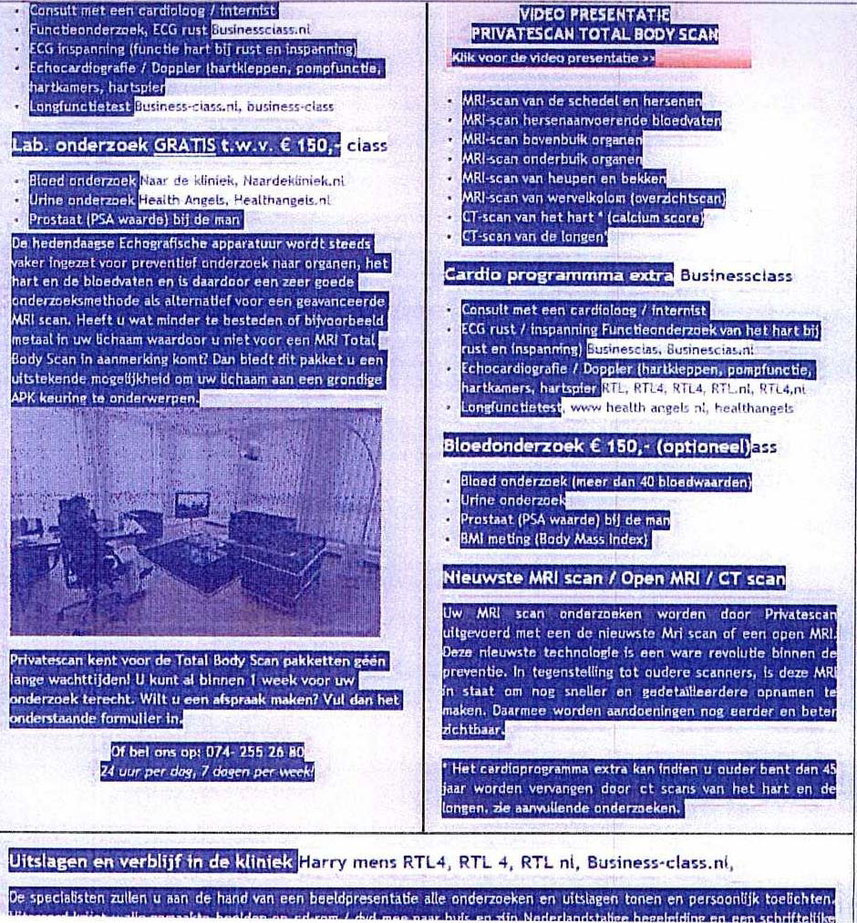 Tot slot wordt onrechtmatig gehandeld door Privatescan c.s. door aan te haken op marketing- en reclameactiviteiten: de woorden "Business Class", "Naar de Kliniek" en "Harry Mens" worden namelijk in witte letters tegen een witte achtergrond geplaatst zodat deze onzichtbare termen als zoekterm door een zoekmachine zal worden herkend. Ook de term "bekend van tv" is misleidend als Privatescan nog niet op televisie was verschenen. Privatescan wordt veroordeeld tot betaling van schadevergoeding ad €1.662.000,--. Dit bedrag bestaat uit de brutowinst van Privatescan die naar schatting van Prescan van januari 2007 tot en met juni 2009 samen met de geschatte brutowinst over een periode van 3 jaar vanaf juni 2009 beloopt.